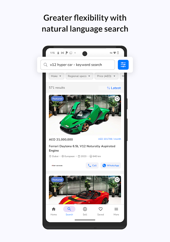 فروش خودرو در DubiCars نیز یک فرآیند آسان است. برنامه DubiCars از جدول مشخصات دقیق گرفته تا توضیحات مفصل و طولانی خودرو، مکان مناسبی برای فهرست کردن خودروی شما برای فروش در امارات است. با صدها هزار بازدید کننده در هر ماه، لیست فروش خودروی شما مطمئناً خریدار پیدا می کند. در صورت نیاز به فروش خودرو با عجله، DubiCars آگهیهای VIP Home، Premium، ویژه را ارائه میدهد که به شما امکان میدهد خودروی خود را در بالاترین لیست قرار دهید.