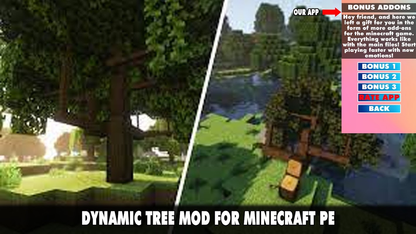 😀🤣If you are tired of the regular version of Minecraft and want to diversify the gameplay, you can install one of our modifications. This is what we talked about above. But this will not be an ordinary addition that adds fabulous animals, new locations or props, but a unique mods. You can download the always updated Dynamic Tree Mod for Minecraft Pocket Edition 2022!🤣😀