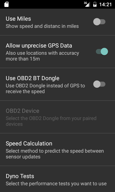 با DynoMeter شما می توانید عملکرد وسیله نقلیه خود را اندازه گیری کنید. علاوه بر حداکثر مقادیر سرعت و انعطاف پذیری، اندازه گیری زمان برای 1/4 یا 1/8 مایل ممکن است. برای اندازه گیری دقیق تر، علاوه بر سرعت GPS، شتاب فعلی خودرو مورد استفاده قرار می گیرد. تمام نتایج در یک پایگاه داده محلی ذخریه می شود و همچنان می تواند بعد از اجرای آزمون در نمایه مربوطه خودرو نمایش داده شود.