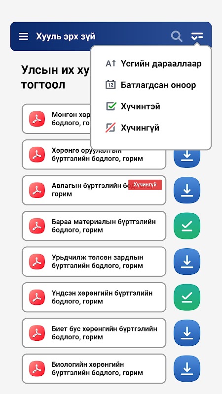 Энэ аппликейшн нь газар нутаг, орон зайнаас үл хамааран цахим хэлбэрээр Байгаль орчны салбарын хууль, дүрэм, журам, жагсаалт, стандарт, сайдын тушаал, захиргааны хэм хэмжээ тогтоосон актыг интернэтэд холбогдоогүй буюу офлайн хэлбэрээр харах боломжтой.
