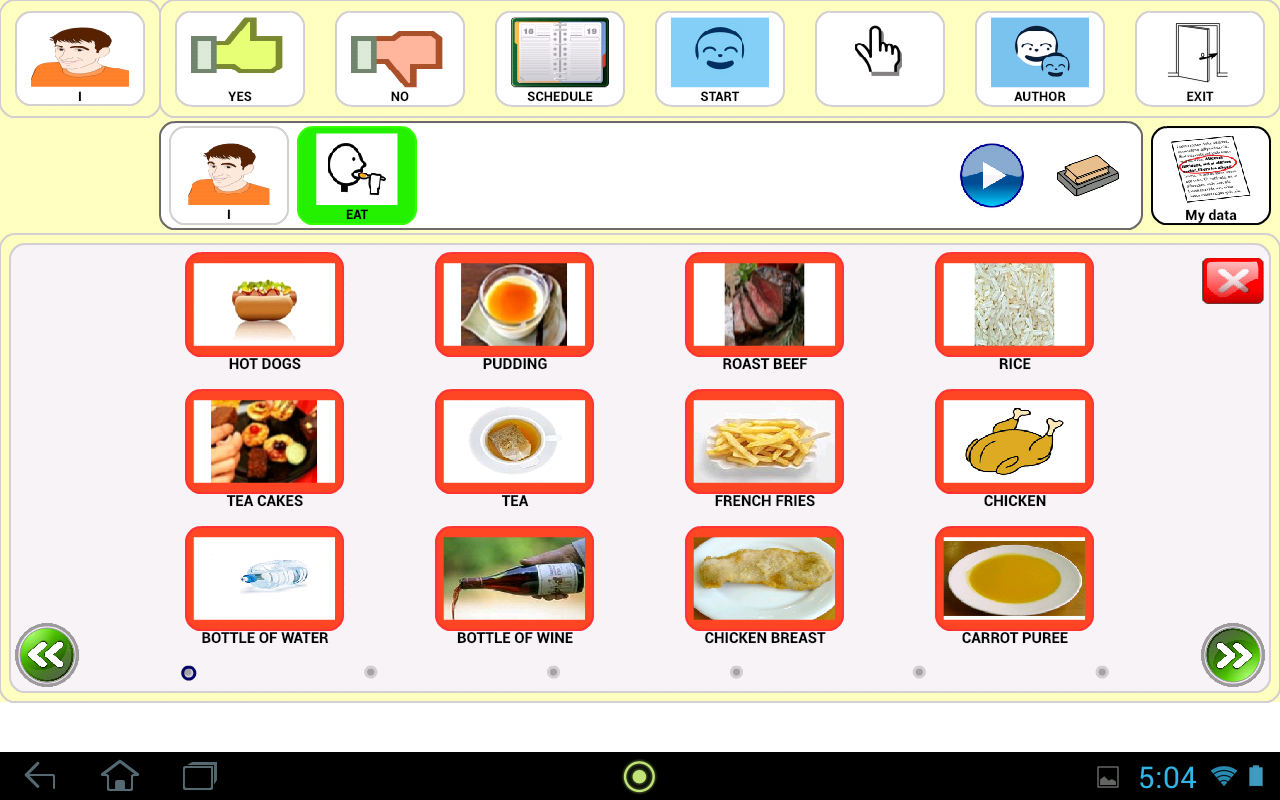 - e-Mintza: opens up a board so that when pressing on every category a new screen opens showing a series of pictograms. Each one has an associated sound and when pressing each pictogram a voice sends a message directly to the board which then constructs the phrase. For example, in the food category, different dishes and foods are offered and the user can choose among them (shown with photographs or pictograms). The program speaks with real voices, in euskera or Castilian, donated by collaborators of various ages.