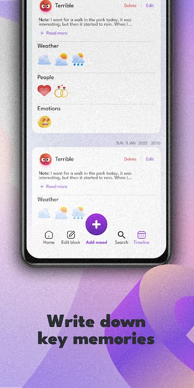 هر روز برداشت ها و احساسات جدیدی را به ارمغان می آورد و برنامه Every Day به شما کمک می کند آنها را در قالبی مناسب ذخیره کنید. با برنامه ما، می توانید یادداشت های دقیقی در مورد هر روز، از جمله آب و هوا، خلق و خو، فعالیت ها و موارد دیگر ایجاد کنید. هر ورودی بخشی از تقویم منحصر به فرد شما می شود، که می توانید آن را به دلخواه شخصی سازی کنید.