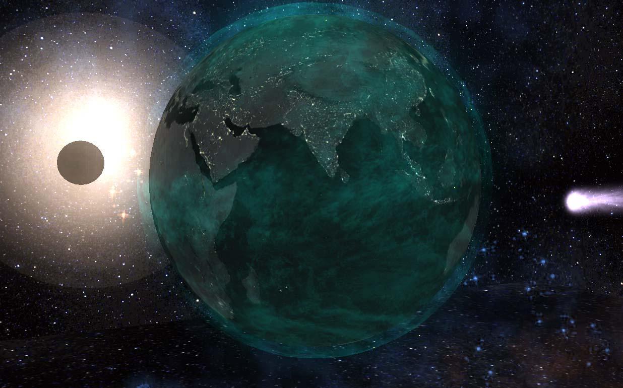 Incredible view of the third planet from the sun. Change of day and night, in the east wake up the sunrise, in the west everything is plunged into night lights. The moving clouds in the circle of the planet are poured, collected in one place and dissolve in another. A swarm of artificial satellites enveloped the earth. Periodically fly comets that threaten the planet.