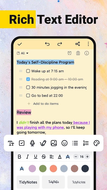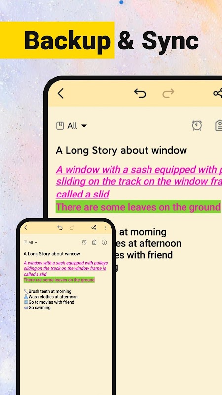 There are various color note widget themes for you to present your tasks when you open the phone. You can access your notes conveniently.