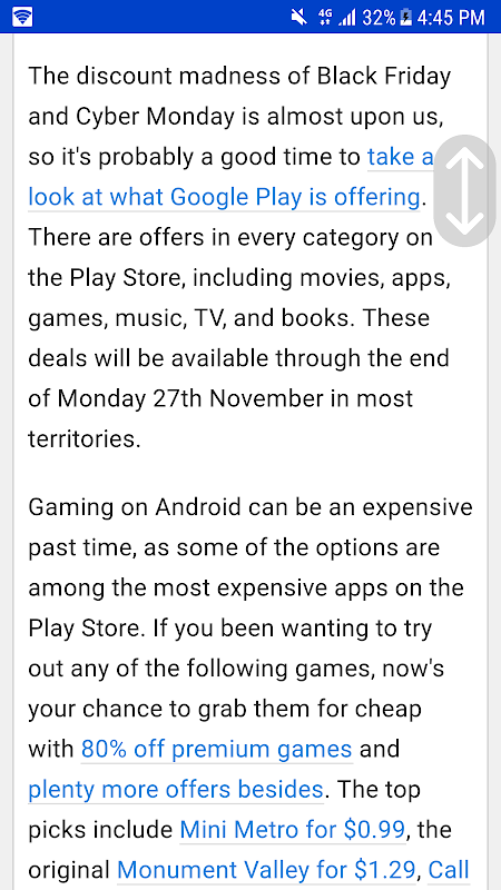 PLEASE NOTE: Easy Scroll performs scrolling by doing an automated swipe gesture on behalf of the user. For technical reasons, this automated scroll cannot be as smooth as manual scrolling. Accordingly, the scrolling speeds Easy Scroll offers are not designed for reading along while scrolling, but for browsing through menus at medium speed, as well as for swift scrolling on after you are done reading a page of text.