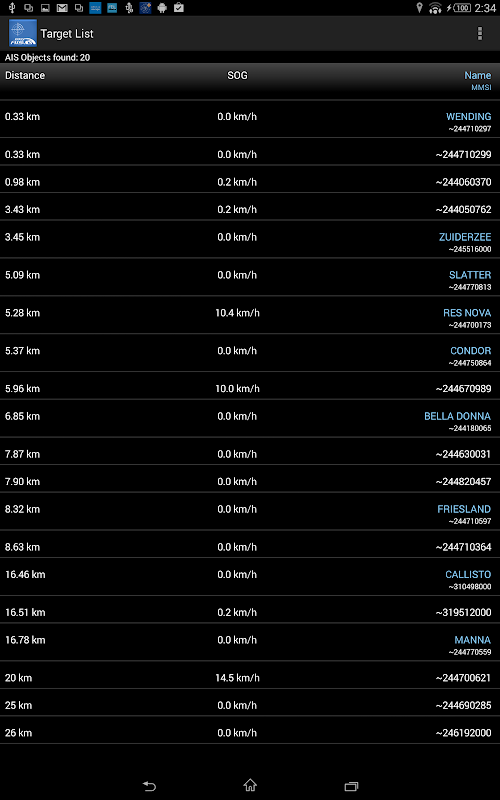 فقط با ضربه زدن به صفحه نمایش بر روی هدف AIS شما به ارمغان می آورد به یک لیست با تمام جزئیات انتقال این هدف، به عنوان مثال موقعیت GPS، corse بیش از زمین، سرعت بر روی زمین نام کشتی،، با ورود به سیستم، طول، عرض، پیش نویس، بندر از ثبت نام ...