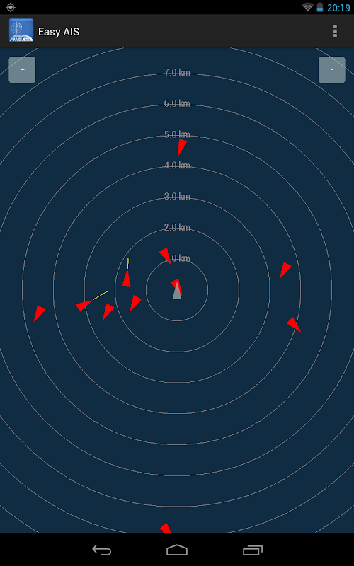 صفحه اصلی پس از شروع برنامه، یک صفحه نمایش رادار مجازی نشان می دهد که اهداف AIS در موقعیت نسبی به شما می باشد