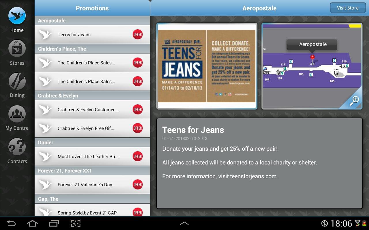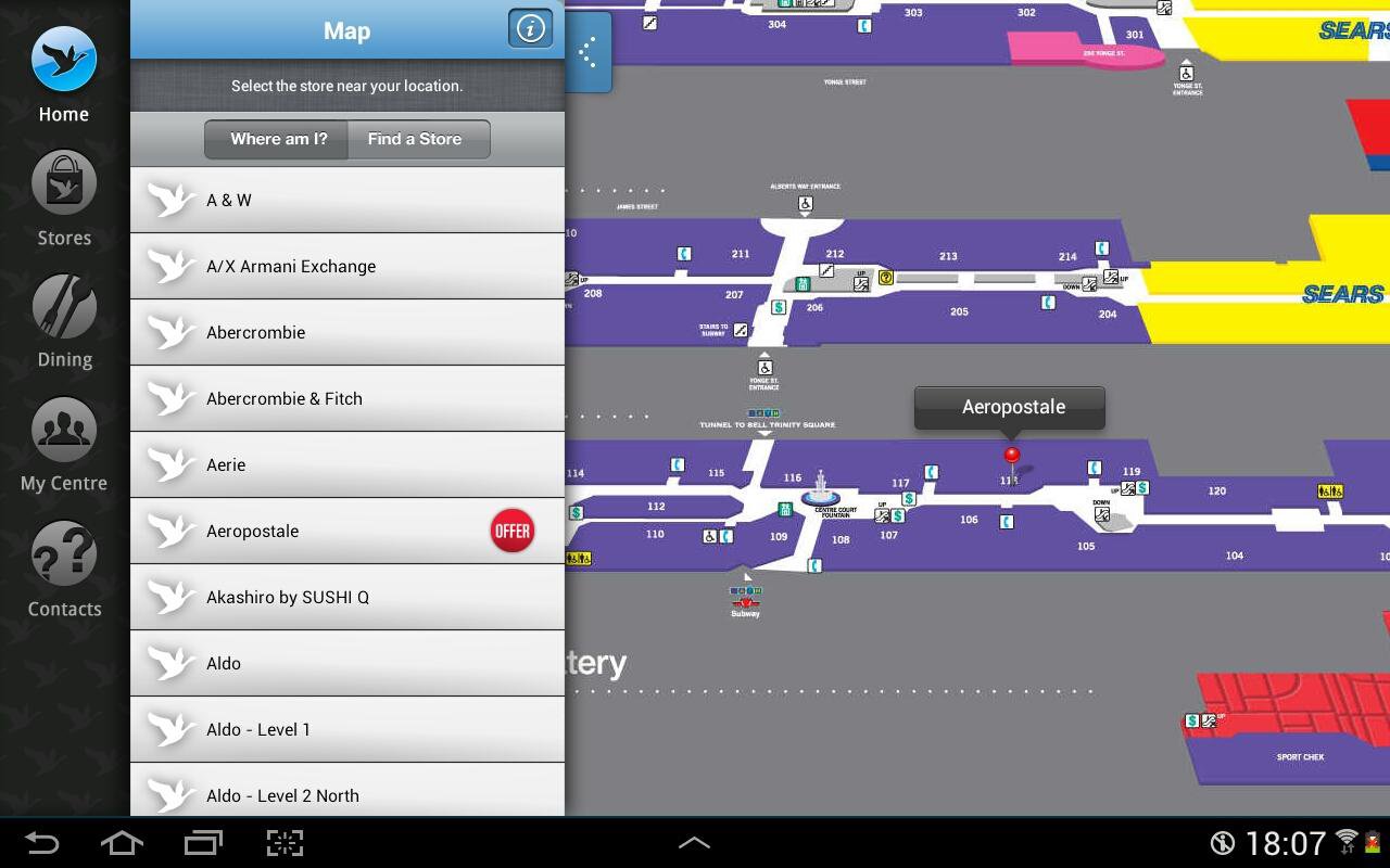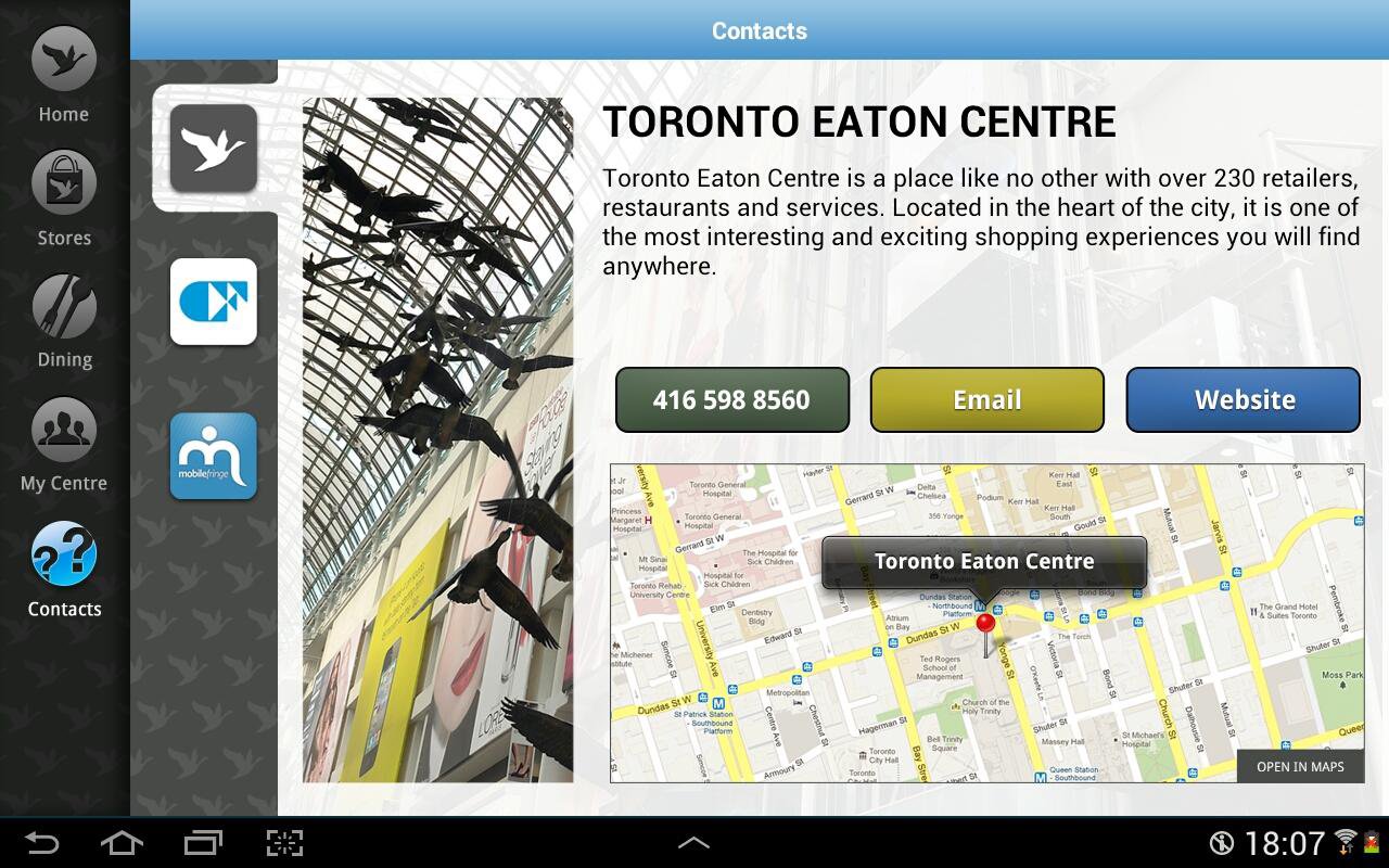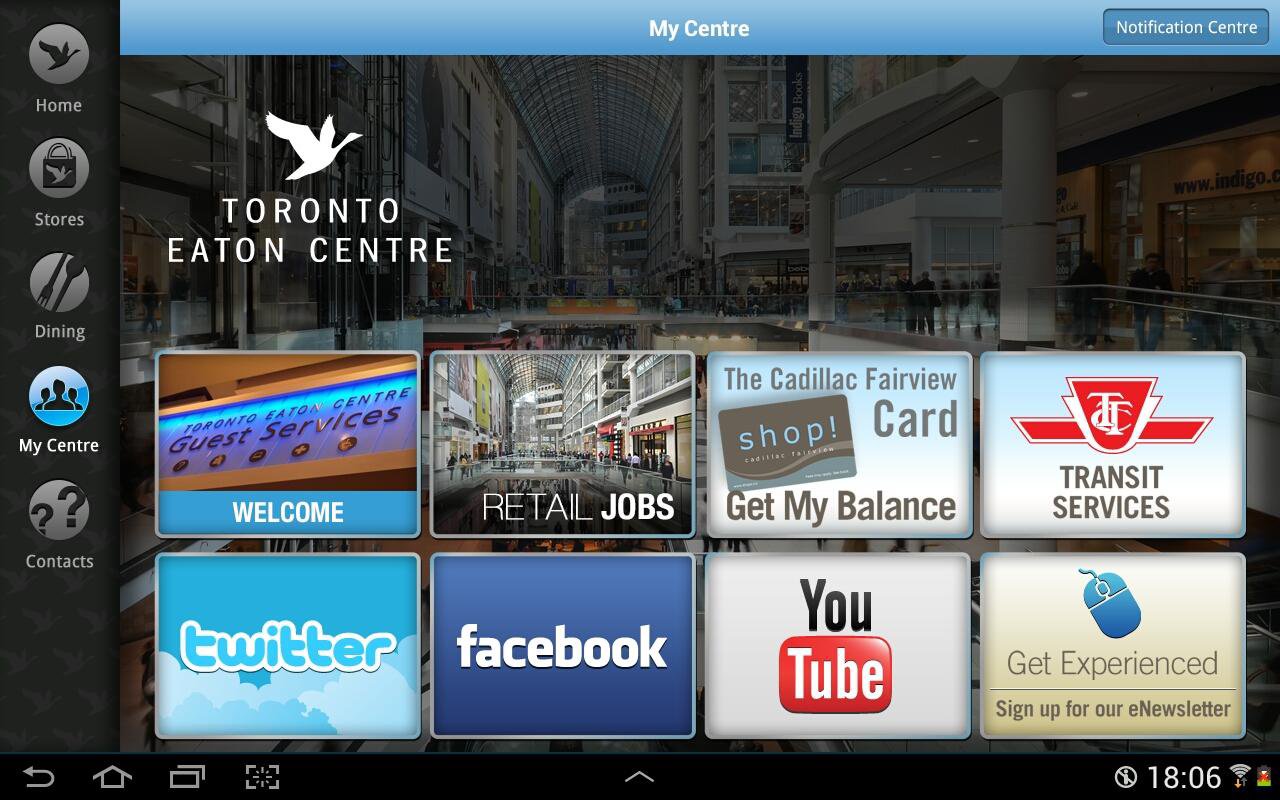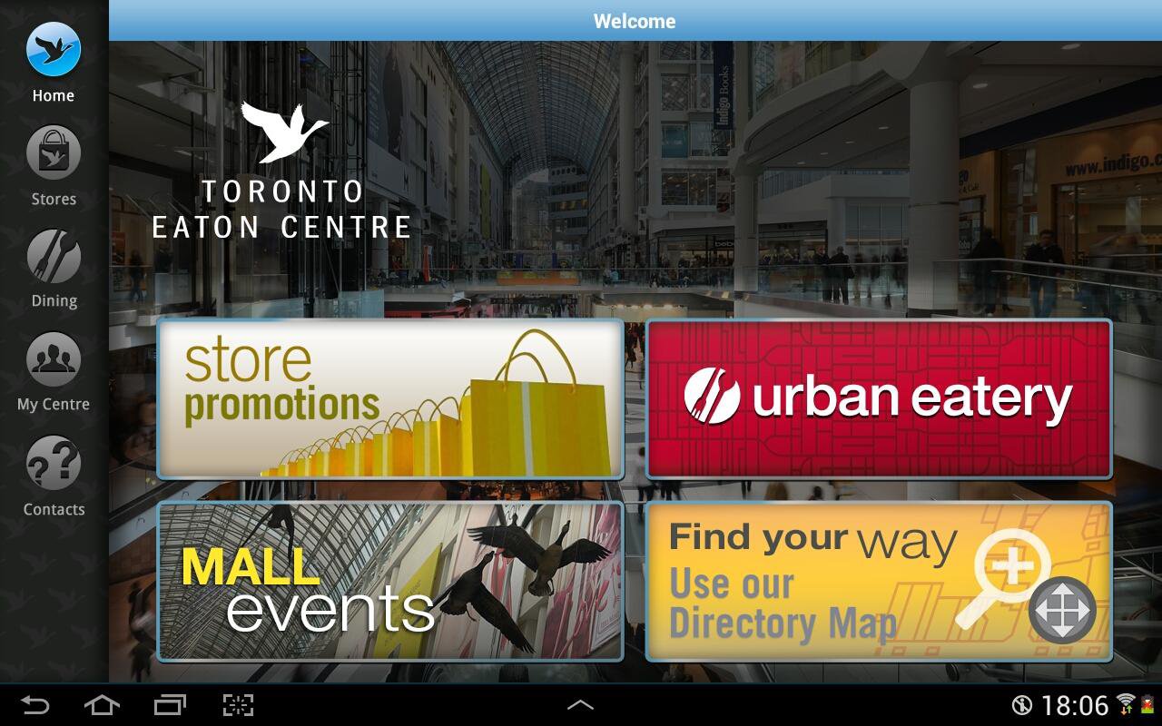 The Toronto Eaton Centre App features are made to enhance your shopping experience. If it is your first time at the mall or you are a regular ? going to the Toronto Eaton Centre will never be the same. Find easy access Store Promotions, check your shop!¢‚ Card Balance, find your way with the Interactive Mall Map, connect with friends using our Twitter and Facebook features and much more.