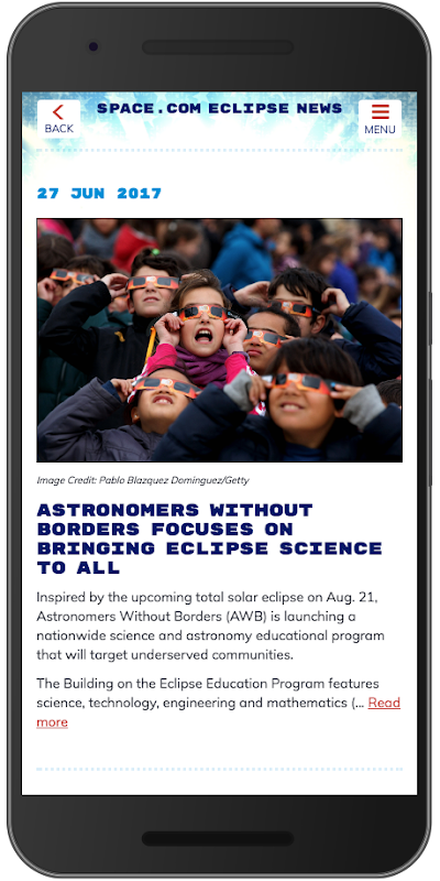 Eclipse Safari is your comprehensive interactive guide to the August 21 2017 Total Solar Eclipse of the Sun, visible along a narrow path spanning the USA from the West coast to the East coast. It's a free app developed by the makers of the award-winning SkySafari 5 astronomy app in collaboration with Space.com, the premier source of eclipse and space news.