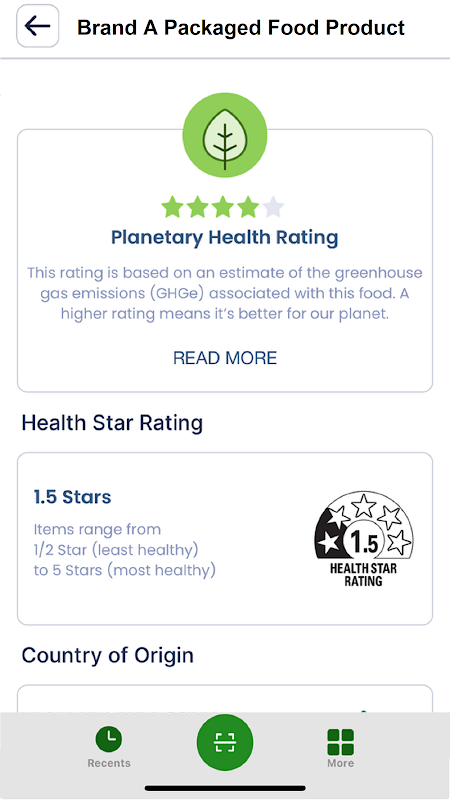 • رتبه بندی سلامت سیاره ای --- با رتبه بندی ساده ستاره ای ما، مشاهده کنید که چگونه غذاهایی که اسکن می کنید در انتشار گازهای گلخانه ای نقش دارند. هر چه یک محصول ستاره های بیشتری داشته باشد، مضرات آن برای سیاره ما کمتر است.