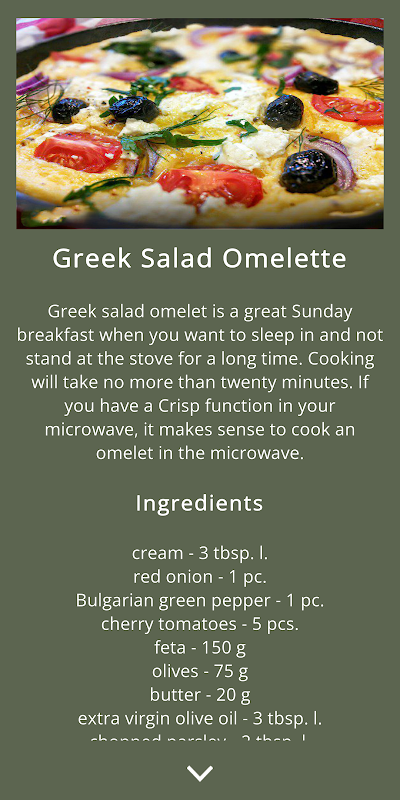 Eggs are the most important product in the kitchen. Egg dishes are delicious, nutritious and quick to prepare. Eggs are combined with almost all products, and this makes it possible to experiment. The application " Egg recipes" contains the best egg recipes. You no longer have to think long and hard about what to cook for breakfast. Available ingredients and step-by-step cooking methods that even a beginner can handle. If you are tired of the usual scrambled eggs and want to please yourself and your loved ones with something new, try making omelettes with a variety of toppings, srambles, muffins, rolls, egg salad or orsini eggs. Click any dish on the main page and start cooking.