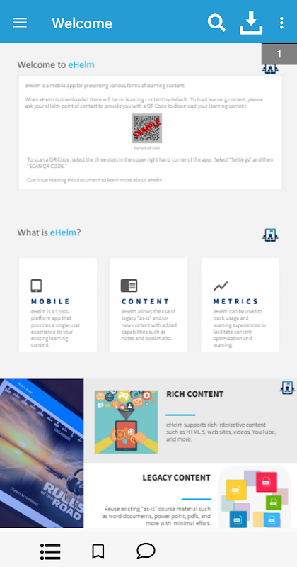 eHelm یک برنامه ارائه است که محتوای آموزشی تعاملی را نشان می دهد که توسط یک مدیر برنامه درسی ایجاد و تنظیم شده است. پس از بارگیری eHelm با استفاده از اسکنر کد QR درون برنامه بر روی یک کد QR مربی (یا با وارد کردن آدرس اینترنتی ارائه شده توسط مربی) ، باید یک "بسته محتوای" آموزش بارگیری شود. eHelm دارای ویژگی های یادداشت برداری و نشانه گذاری است تا یادگیری خود گام را تسهیل کند. بسته های محتوا می توانند شامل PowerPoints ، PDF ها ، اسناد Microsoft Word ، فیلم ها ، HTML و موارد دیگر باشند - به مدیران برنامه درسی انعطاف پذیری برای استفاده مجدد از مطالب آموزشی میراث می دهند. بسته های محتوا ممکن است توسط مدیر برنامه درسی تنظیم شده باشد تا پیشرفت دانش آموز را به یک فروشگاه سوابق یادگیری گزارش دهد.