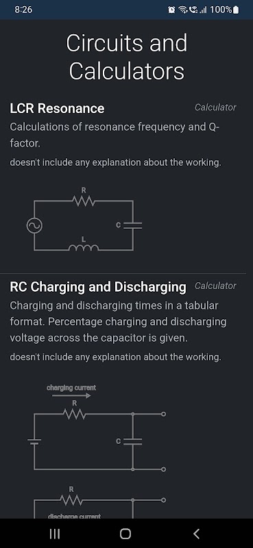 مدارهای پایه الکتریکی و برای محاسبه تعاملی مقادیر اجزای الکتریکی برای مدارهایی مانند مدارهای سری، موازی R، RC و RLC.