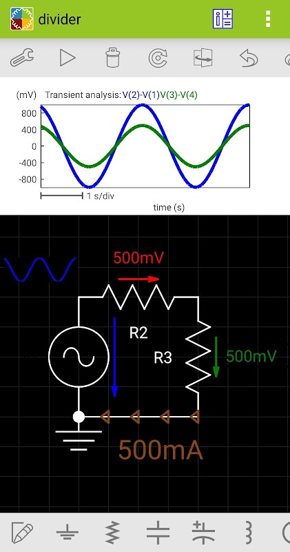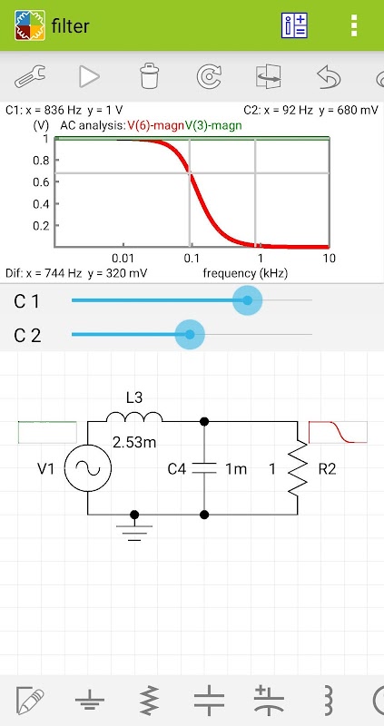 این ابزارها امکان ایجاد آسان نمودارهای مدار و تجزیه و تحلیل SPICE مدارهای ایجاد شده را فراهم می کند. شبیه ساز بر نمایش بصری نتایج شبیه سازی شده متمرکز است، به طوری که ولتاژها و جریان های شبیه سازی شده را می توان در جای دیگری از مدار، به عنوان یک متن یا نمودار قرار داد. علاوه بر این، بزرگی و قطبیت ولتاژها و جریان ها را می توان با نشانگرهای بصری نشان داد، بنابراین می توانید نتایج را به سرعت بررسی کنید. تمام نتایج را می توان علاوه بر این در نمودار بالا نمایش داد، جایی که می توان آنها را با استفاده از دو مکان نما کاوش کرد.