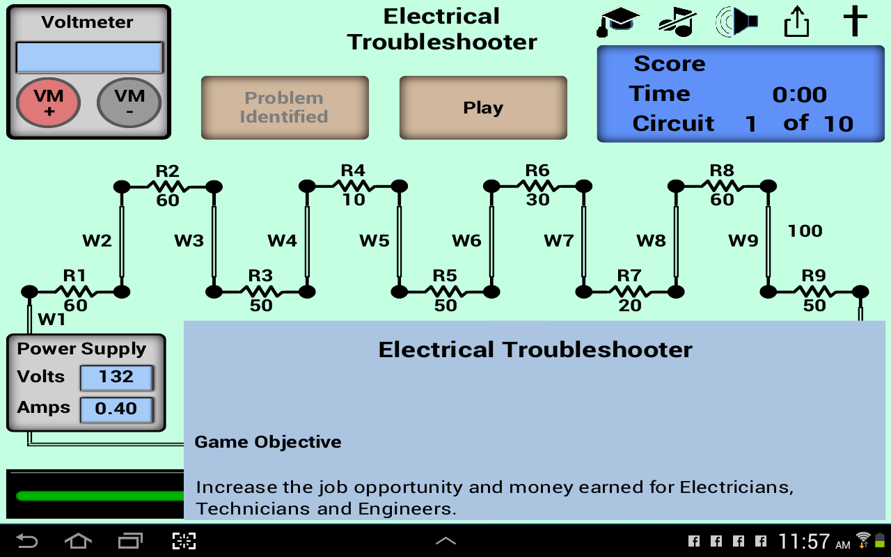 این برنامه یک ابزار / بازی ساده برای یادگیری عیب یابی الکتریکی با ولت متر است. یک ولت متر یکی از ابزارهای با ارزش ترین است که رفع مشکل الکتریکی توانید استفاده کنید. دلیل این است که بسیاری از مشکلات الکتریکی اتصال شل (مدار باز)، دستگاه های اتصال کوتاه و یا خطاهای اپراتور (بدون مشکلات الکتریکی). ده مدارهای در هر بازی وجود دارد. هر مدار شامل "باز کردن"، "کوتاه" و یا "NoProblem".