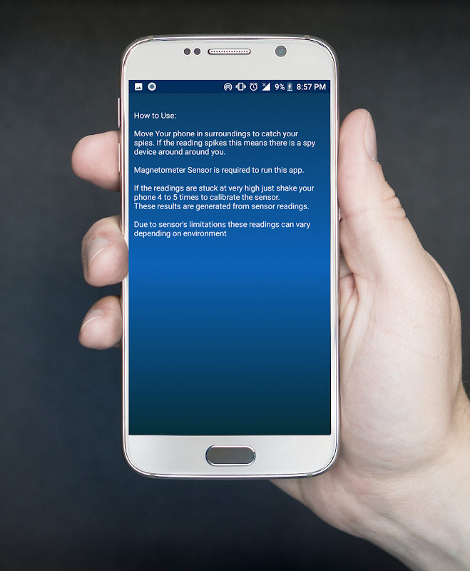 The app use magnetic field sensor. that is why the readings can be distorted by any metal or electronic device. When you are using our detector just try to keep any distortion away. This spy bug scanner is very easy to scan the device or bug in your surroundings.