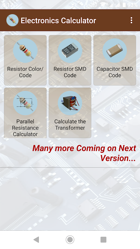 ماشین حساب الکترونیک آسان ترین برنامه برای محاسبه قطعات الکترونیکی رنگ / کد است. به عنوان مثال: مقاومت / خازن و غیره.
