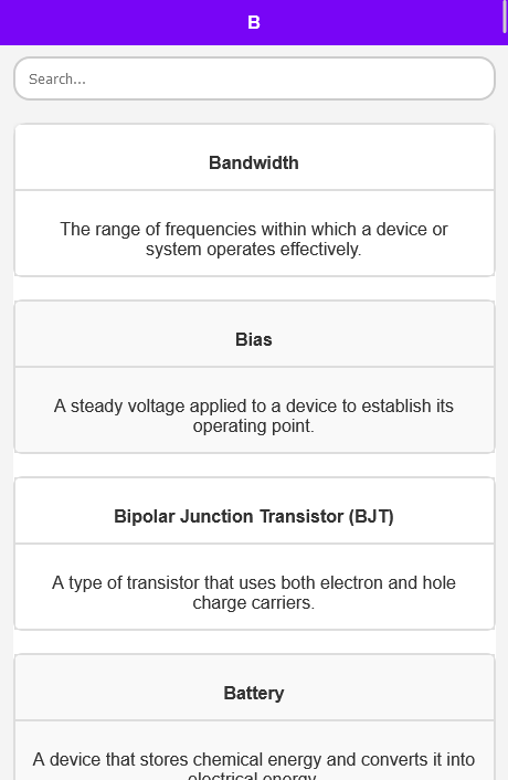 مجموعه گسترده: مجموعه وسیعی از اصطلاحات الکترونیکی را که از A تا Z سازماندهی شده اند کاوش کنید. هر ورودی به دقت تنظیم شده است تا تعاریف واضح، مختصر و دقیق ارائه کند.
