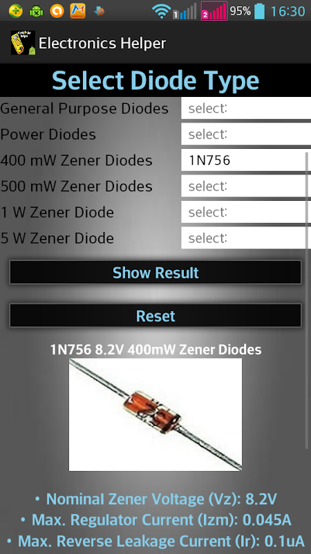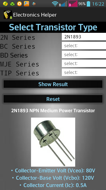 این همچنین شامل "مقاومت کد رنگ برنامه ماشین حساب" همراه با تقریبا تمام ترانزیستور و دیود مشخصات سری.