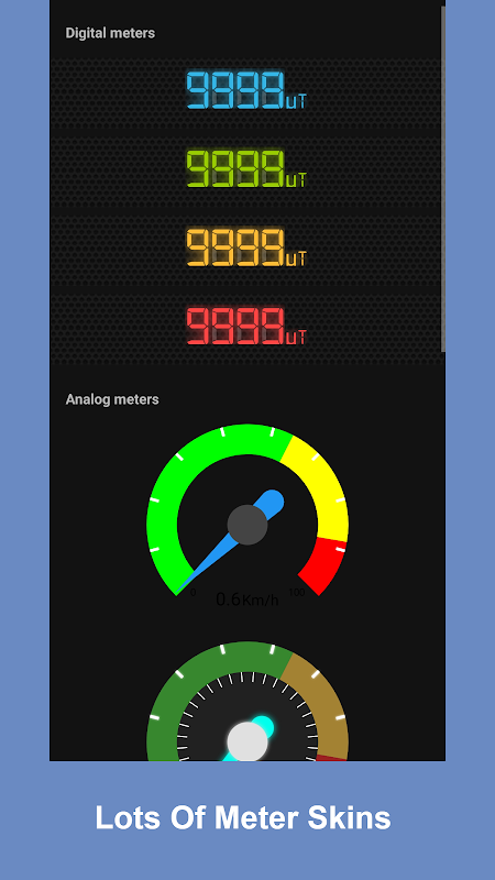 This Ultimate EMF detector & EMF Scanner app for android has two broad types of meters to indicate the EMF readings. One is digital EMF meter and other one is analog EMF meter. This free electromagnetic field sensor app also produces beep sound when a potential EMF is detected. It also contains many skins for the two types of EMF Detectors. This app also allows to choose between two units for the readings to be shown on screen. micro-Tesla and milli-Gauss.