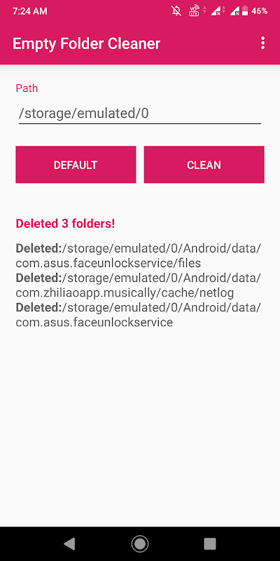 This app will help you delete all empty folders and sub-folders on your device. Also you can select folder to delete all empty folders and sub-folders only inside of it.