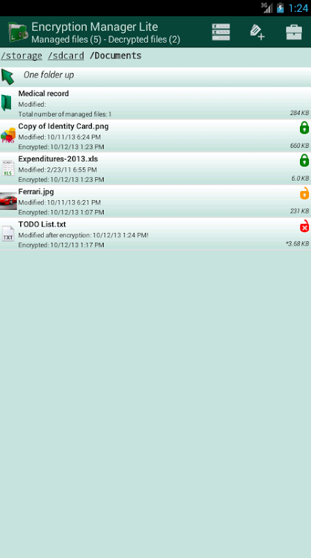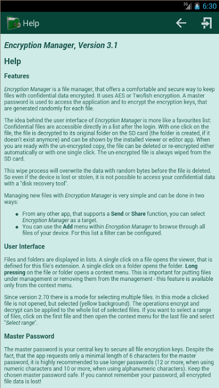 از رمز ورود اصلی هم برای دسترسی به برنامه و هم برای رمزگذاری کلیدهای رمزگذاری استفاده می شود که به صورت تصادفی برای هر پرونده تولید می شوند و توسط مدیریت رمزگذاری مدیریت می شوند. پرونده های محرمانه مستقیماً پس از ورود به سیستم قابل دسترسی هستند. با یک کلیک بر روی فایل ، فایل در مکان اصلی خود رمزگشایی می شود و توسط برنامه های بیننده یا ویرایشگر نصب شده نشان داده می شود. هنگامی که کار با نسخه رمزگشایی به پایان رسید ، پرونده با یک کلیک دوباره رمزگذاری می شود و فایل رمزگشایی شده از کارت SD پاک می شود. قبل از حذف پرونده ، این فرآیند پاک کردن داده ها را با بایت تصادفی رونویسی می کند. بنابراین حتی اگر دستگاه گم شود یا به سرقت برود ، دسترسی به اطلاعات محرمانه شما امکان پذیر نیست.