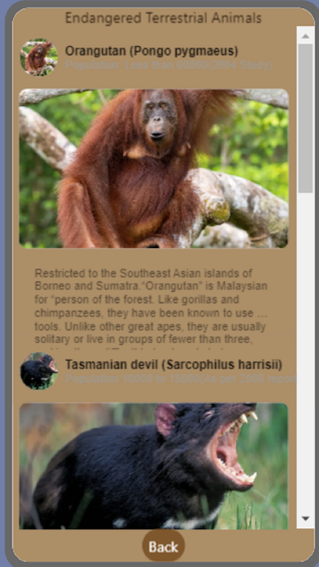 این به شما در مورد حیوانات در حال انقراض می آموزد. وقتی در 3 صفحه به دنبال حیوانی میگردید که میخواهید درباره آن بیاموزید.
