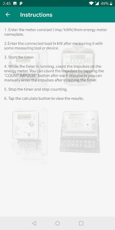 این نرم افزار را می توان برای محاسبه دقت کنتور برق کیلووات ساعت استفاده کرد. فقط ثابت متر (imp / kWh یا rev / kWh) را از متر یادداشت کنید و یک بار تست شناخته شده را با متر وصل کنید. تایمر را شروع کرده و شروع به شمارش تکانه ها بر روی کنتور کنید. بعد از مدتی تایمر را متوقف کرده و مقدار پالس های محاسبه شده را وارد کنید. همچنین می توانید با فشار دادن دکمه "شمارش تعداد" در حالی که تایمر در حال کار است ، مقدار پالس ها را افزایش دهید. نتایج را می توان با فشار دادن دکمه "محاسبه" محاسبه کرد. این تعداد ضربه ها را با دقت 100٪ محاسبه می کند و همچنین درصد خطای متر را محاسبه می کند. کنتور می تواند سریع یا کند باشد. خطای 5٪ در بسیاری از ایالات قابل قبول است.