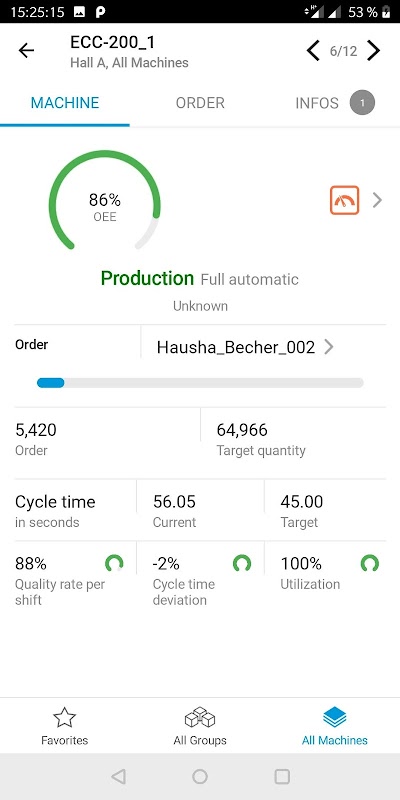 • نمایش سفارش فعلی در هر دستگاه جداگانه از جمله مقدار هدف، پیشرفت تولید (مقادیر خوب و بد) و زمان باقی مانده مورد انتظار