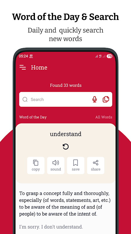 این برنامه به شما کمک می کند به راحتی کلمات انگلیسی را جستجو کنید و معانی، تعاریف و تلفظ صحیح آنها را کشف کنید. همچنین می توانید کلمات را ذخیره کنید تا بعداً آنها را مرور کنید و دایره لغات خود را گام به گام بهبود بخشید.