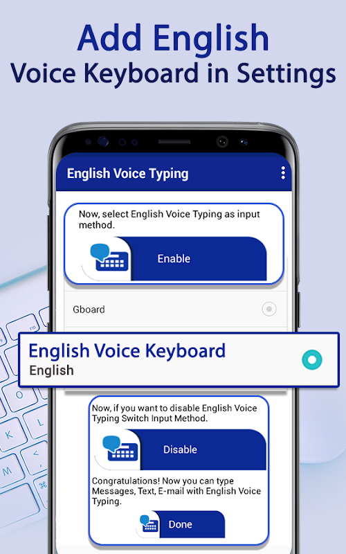 English Voice typing keyboard allows you to type English text through voice typing. English voice keyboard is an easy to use and helps to write English through voice recognition English voice typing keyboard converts your voice into English text. The text will appear after you stop speaking. Speech to text keyboard in English keyboard saves a lot of time and effort of typing English words. The text appears as soon as you start speaking into the application. Once you get used to this app, you can use it to create and share long texts and articles on social media platform and messaging application