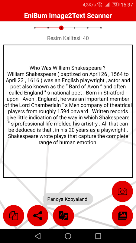 OCR (تشخیص کاراکتر نوری) یک تکنولوژی مورد استفاده برای تبدیل تصویر به یک سند متنی است. با این نرم افزار شما می خواهید برای دیدن (مجلات، کتاب ها، و غیره) می توانید اسناد متنی تبدیل، شما می توانید از صفحه کلید ساعت های طولانی خلاص، شما می توانید آن را به اشتراک هر کجا که می تبدیل متن. روشن کردن مرورگر تلفن خود، به لطف یک برنامه کاربردی پیشرفته.