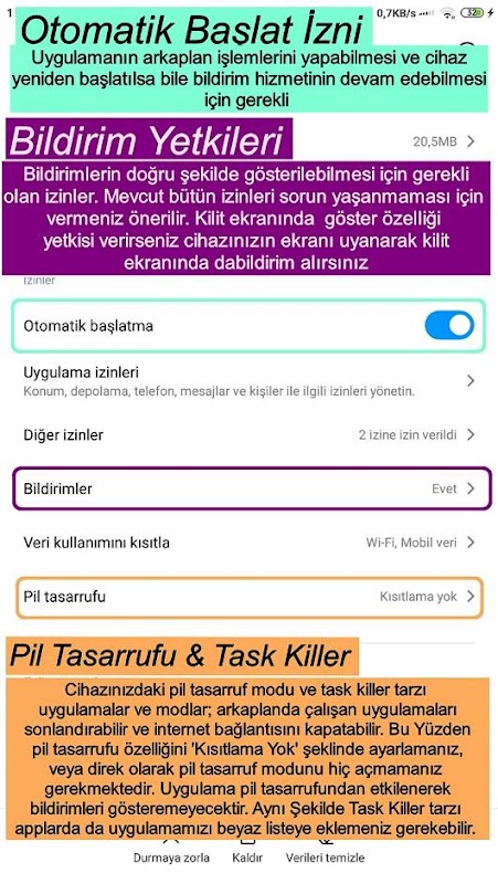 برای اینکه اعلان ها کار کنند ، باید به برنامه اجازه کار در پس زمینه ، اعلان های نمایش ، اولویت اعلان ، اجازه نمایش در صفحه قفل ، راه اندازی مجدد خودکار ، معافیت از بهینه سازی باتری داده شود. این برنامه باید از برنامه های باز کردن قوچ و کارهای قاتل سبک معاف باشد. برنامه هرگز نباید به زور توسط کاربر پایان یابد.