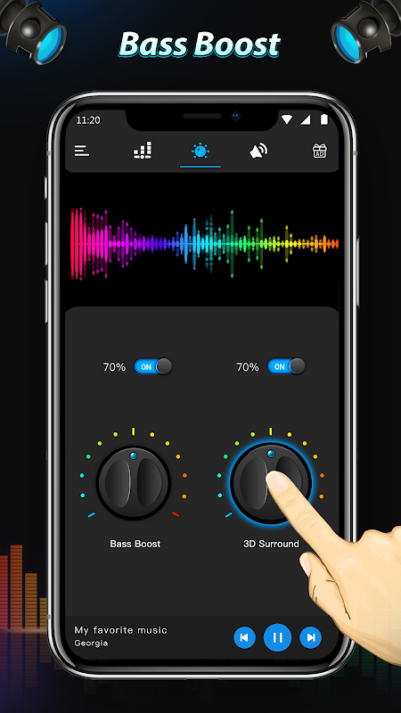 * روشن کردن اکولایزر و باس برنامه تقویت کننده و تنظیم سطح صدا و فرکانس.