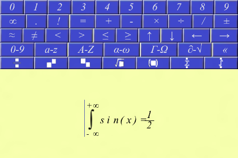 ایجاد معادلات و هنر نامه در حال حرکت. استفاده از تلفن همراه خود برای ایجاد معادلات. آسان و بصری 2D سیستم ناوبری. مفید برای یادداشت برداری در سخنرانی ها و یا برای صرفه جویی در معادلات است که شما می توانید در زمان بعد یاد. شما می توانید هر نوع از معادلات از قبیل چندجمله ای ها، معادلات تانسور ماتریس و یا هر چیزی که شما می توانید فکر می کنم از شما آزادی کامل در مورد چگونگی به ترتیب این نمادها را ایجاد کنید. شما همچنین می توانید هنر ASCII با استفاده از انواع نمادها ایجاد کنید.
