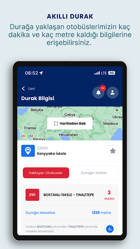 با استفاده از صفحه "جستجو" در برنامه ، می توانید به خطوط و ایستگاه های اتوبوس دسترسی پیدا کنید ، می توانید ایستگاه های خط اتوبوس انتخابی را ببینید و اتوبوس ها را بلافاصله متوقف می کنند. وقتی ایستگاه را انتخاب می کنید ، می توانید اتوبوس هایی را که بلافاصله به ایستگاه نزدیک می شوند و خطوط عبوری از ایستگاه را لیست کنید.