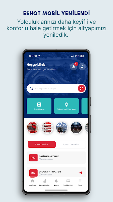 در برنامه رسمی تلفن همراه اداره کل ESHOT ، که می توانید کاملاً شخصی سازی کنید ، می توانید خطوط و توقف هایی را که انتخاب می کنید به لیست علاقه مندی های خود اضافه کنید و به سرعت به موارد دلخواه خود برسید.