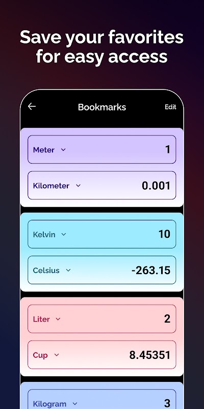 3. ⚖️ دقت بالا⚖️: دقت در تبدیل ها بسیار مهم است. برنامه ما نتایج دقیقی را با درجه بالایی از قابلیت اطمینان ارائه می دهد و آن را هم برای کارهای روزمره و هم برای نیازهای حرفه ای عالی می کند.