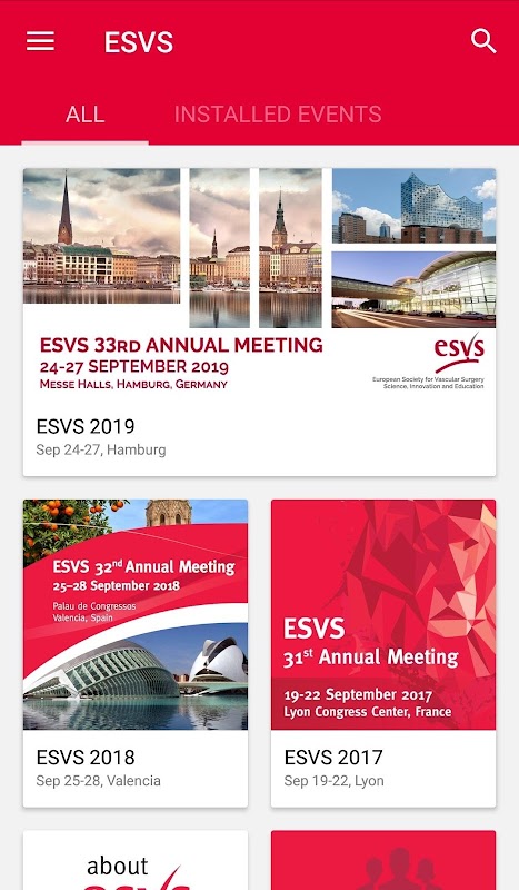 Stay informed, wherever you are, with the ESVS app. Content includes news articles, containing journal summaries as well as ESVS annual meeting coverage. The ESVS application provides the latest information about vascular healthcare, ESVS events, news and research into vascular disease including vascular surgery. This society app allows to download the included events (ESVS Annual Meeting) and will provide attendees with an access to events information, detailed meeting agenda organized into programme topics for easy access and navigation, featuring a customizable calendar integration and interaction with speakers and attendees via rating, voting and Q&A options.