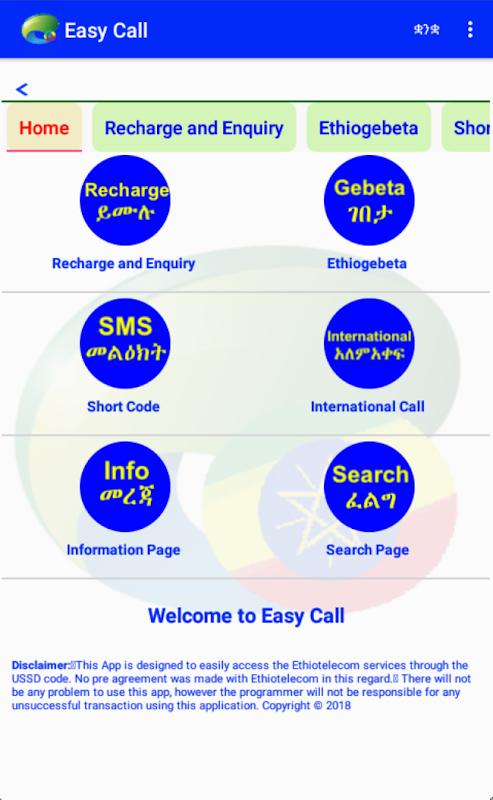 This App is designed to easily access the Ethiotelecom services through the USSD code. Easy Call is mainly designed to call easily the USSD short codes by only selecting the institutions and enter values easily without necessarily remembering the code and the sequences. It is menu driven and protect the users from any mistakes. It will in addition help you to call to any country without bothering the international code of each. Some additional functions like Ethiotelecom services, and search facility are also included. No pre agreement was made with Ethiotelecom in this regard.
