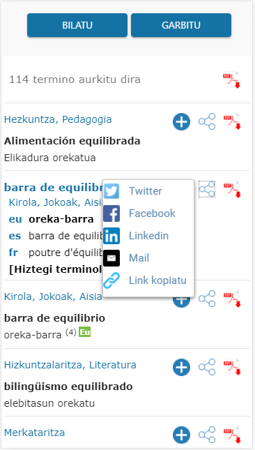 با استفاده از این نرم افزار ما می توانیم نمایش داده شد EUSKALTERM اصطلاحات تخصصی، بانک اصطلاحات عمومی (www.euskara.euskadi.net/euskalterm). در اصطلاحات بانک تصویب شده و توصیه شده توسط کمیته اصطلاحات از شورای مشورتی تشکیل شده است Euskera. شرایط توصیه شده توسط کمیسیون علامت گذاری شده اند 4 به علاوه نماد اتحادیه اروپا؛ شرایط علامت گذاری شده اند 3 نیز شرایط پذیرفته شده توسط کمیسیون هستند ولی اولویت نیست. به خاطر داشته باشید که هنگامی که شما انجام جستجو، شما می توانید دامنه استفاده را مشخص کنید. به عنوان مثال، اگر شما برای 'منابع' جستجو و جمع این زمینه، در نتیجه 119 نظر ما ظاهر می شود، نیست، بنابراین توصیه می شود برای مشخص کردن منطقه است که در آن ما علاقه مند به اصطلاح "رایانه" می باشد، "قانون"، "محیط زیست" یا شخص دیگری.