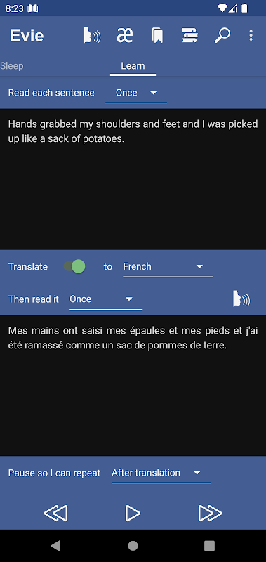 Evie می تواند هر جمله را بلافاصله ترجمه کند، سپس ترجمه را با صدای بلند برای شما بخواند.