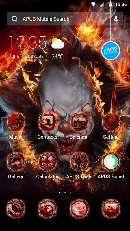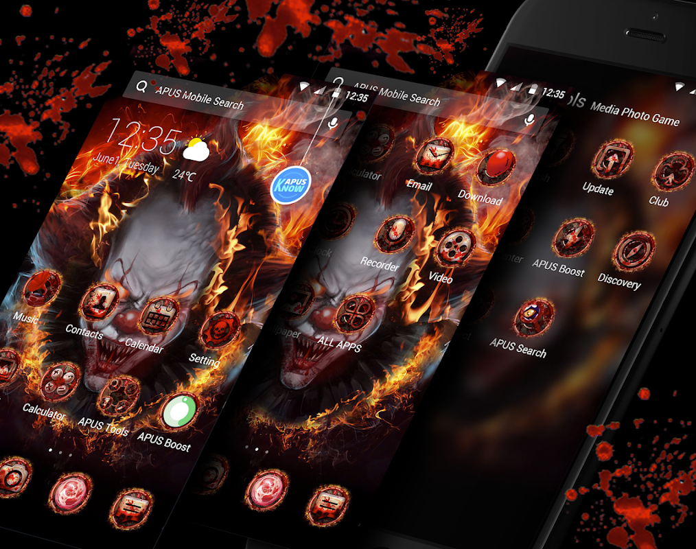 1. Evil Flame Scary Clown Theme & HD wallpapers is free, but only compatible with APUS Launcher. If you want to apply it, please install APUS Launcher on your Android phone. Or download new theme and APUS Launcher. When you install APUS Launcher, there are variety of themes in APUS theme & wallpaper shop, such as lovely unicorn, pink diamond mickey, Red heart lovely, luxury, gold, business, black, simple, magic, comic, football, basketball, cricket, Valentine's Day, New Year, Halloween, Christmas, cute cat and dog, butterfly, dawn theme. Install APUS launcher to enjoy more themes.