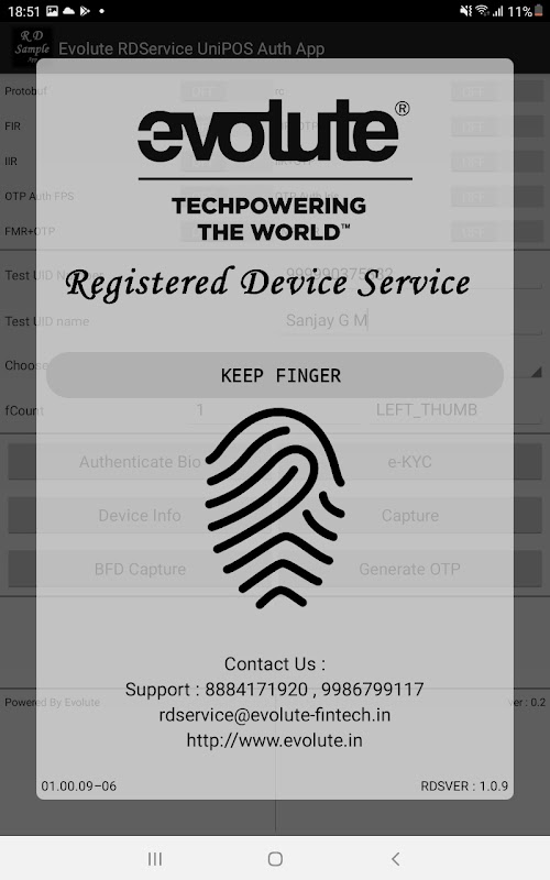 این ثبت خدمات دستگاه (L0) برای دستگاه های در Evolute با اسکنر اثر انگشت برای دستگاه های پلنگ، شاهین، تحت تاثیر قرار دادن، زنبق و IDENTI5 ارائه شده توسط در Evolute سیستم های Pvt آموزشی ویبولیتین این برنامه مورد نیاز است برای استفاده از دستگاه با احراز هویت AADHAAR. این نرم افزار تصویر برداری اثر انگشت عنوان دستورالعمل در هر UIDAI برای Aadhar احراز هویت و eKYC. RD خدمات برای دستگاه های ما را قادر به راه حل خود را و کاربران نهایی به اعتبار دستگاه اثر انگشت خود را با UIDAI با کمک سرور مدیریت ما است. برای ثبت دستگاه اثر انگشت با UIDAI، شما باید نیاز به در اختیار داشتن حداقل یک واحد از دستگاه تکامل باشد. راه اندازی شده توسط نرم افزار و با اتصال دستگاه، خدمات RD باید پروسه های لازم برای ثبت نام از دستگاه خود با UIDAI کامل است. RD خدمات STQC گواهی به عنوان در هر UIDAI ثبت دستگاه مشخصات-V2.0.1 است. دستگاه برای اکثر استفاده از سهولت در حالی که قرار دادن انگشت طراحی شده است. دستگاه ساخته شده است به مقاومت در برابر مقادیر زیادی از شوک حتی سقوط آزاد از عنوان در هر آزمون سقوط. در صورت هر گونه خطا، شما باید پیغام خطا مناسب که با آن شما می توانید میز کمک ما به شرح زیر در هر روز کار در ساعات اداری با توجه به رویکرد داده شود.