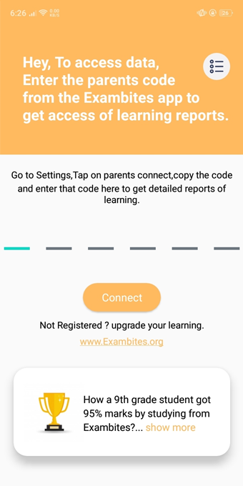برنامه به والدین کمک می کند تا با پیشرفت و عملکرد فرزندشان از برنامه یادگیری Exambites به روز باشند. کودک بهترین عملکرد را دارد که والدینش به طور مداوم به او در تحصیل کمک کنند.