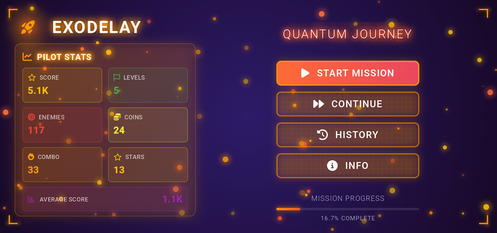 ExoDelay یک پلتفرم آیندهنگر سریع است که در آن یک فضاپیمای با فناوری پیشرفته را از طریق دالانهای درخشان انرژی کوانتومی هدایت میکنید. ماموریت شما این است که از موانع در حال تغییر عبور کنید، شکلهای زندگی بیگانگان متخاصم را شکست دهید، و سلاحها و تقویتکنندههای پیشرفته را جمعآوری کنید در حالی که بالاترین امتیاز را در سطوح چالشبرانگیز دنبال میکنید.