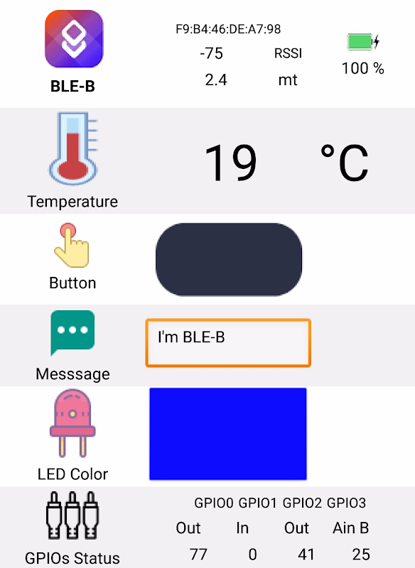 With the MakeApp, you can detect BLE-Bs in the surrounding area, read their relative information and eventually send commands to them.
