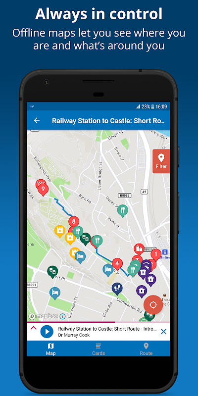 صوتی به همراه شما - می شود با موسیقی و آهنگ نقل مکان کرد، لذت بردن از داستان در مورد مناطق اطراف آن و استفاده از مسیرهای پیاده روی های صوتی برای یادگیری در حالی که شما سفر می کند.