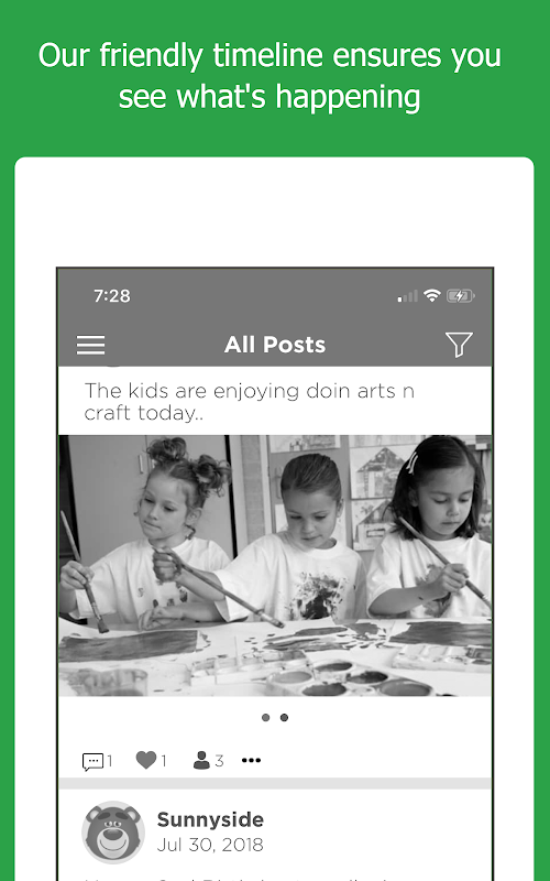 به داده های مربوط به فرزندتان در زمان واقعی از جمله آمار حیاتی مانند غذا و مایعات مصرف ، بررسی خواب ، تغییرات پوشک و سایر اطلاعات مهم دسترسی پیدا کنید. بعلاوه ، والدین عکس ، فیلم و به روزرسانی را در طول روز از طریق پست اجتماعی کودک خود در حال یادگیری و بازی دریافت می کنند. شما همچنین می توانید روزهای معمولی را رزرو کنید ، بدانید چه اتفاقی با تقویم رویداد ما می افتد و موارد بسیار دیگر.