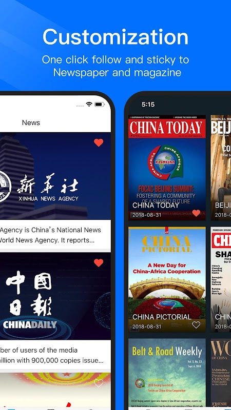 کلیه روزنامه ها و مجلات به موجب قانون دارای مجوز هستند و مارک آن به طور مداوم به روز می شود.از ژورنال های مسافرتی که کوه ها و رودخانه ها را تحسین می کنند گرفته تا مجلات جامعی که ویژگی های اجتماعی را نشان می دهد ، دوست دارید اینجا باشید ، هر مارکی به راحتی می تواند تنها با 0.99 دلار در ماه مشترک شود. درباره چینی بیاموزید ، با China News شروع کنید!